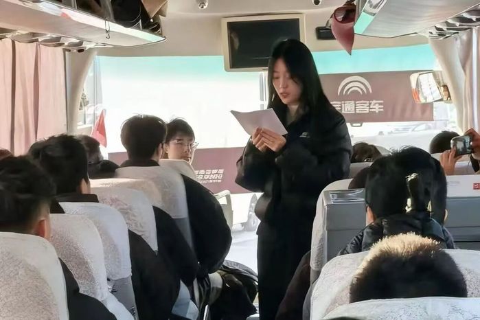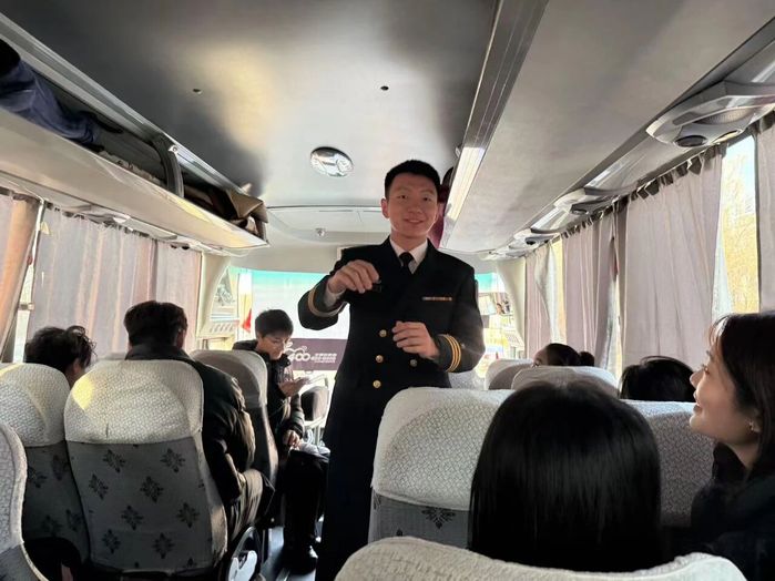 乘车途中,主持人张娜介绍了活动的筹备过程与主旨意义。学院红色精神讲解员孟凡格为大家讲解了铁人王进喜纪念馆的建馆背景与展陈概况,为接下来的参观做好充分准备。随后,退伍士兵李俊洁带领大家齐唱《我为祖国献石油》《歌唱祖国》《强军战歌》《团结就是力量》等红色歌曲。歌声嘹亮,情感真挚,车厢内气氛热烈,各族师生在激昂的旋律中进一步增强了集体认同与民族情感。