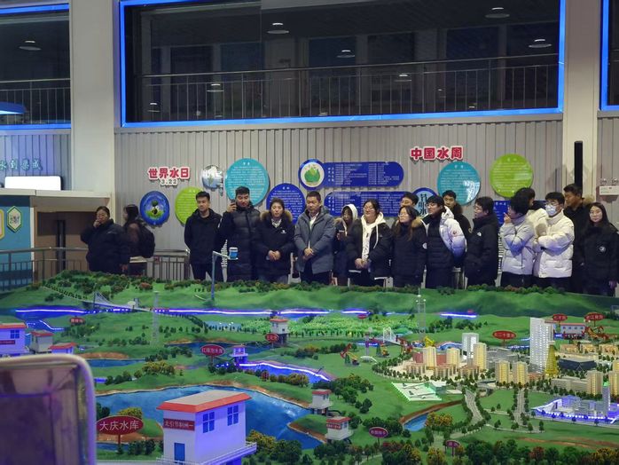 最后,同学们走进智慧水利沙盘展厅。在比例精准的沙盘模型前,专业老师结合流域水资源调配逻辑,详细讲解了水库、溢洪道、水电站、灌溉系统等组成部分的协同工作原理,帮助大家建立起水利枢纽工程的整体化认知。复杂的水利系统在沙盘中清晰呈现,让同学们对“水利工程服务国计民生”的内涵有了更直观的理解。