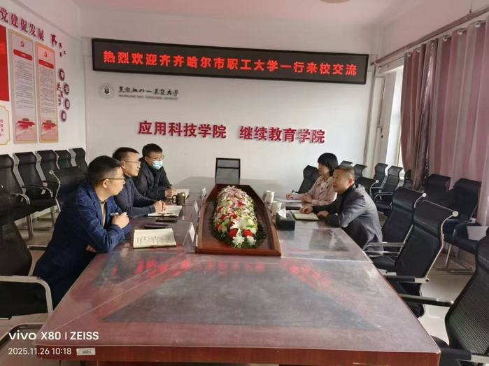 11月26日,学校高等学历继续教育校外教学点齐齐哈尔市职工大学招生办主任尚英奇、教师刘丽丽一行到校交流校外教学点工作。应用科技学院继续教育学院院长宫占元、副院长殷旭晨及相关科室负责人参加座谈。