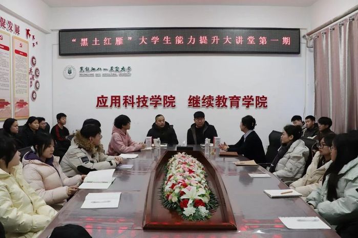 黑龙江省2025年乡村产业振兴带头人培育“头雁”项目培训班在学校正式启动。作为本次项目的承办学院,应用科技学院(继续教育学院)积极响应乡村振兴战略与人才培养融合的号召,鼓励广大学生将论文写在祖国大地上、写在基层实践里。12月17日,学院举办了“黑土红雁”大学生能力提升大讲堂活动。首期讲堂邀请了克东县玉岗镇村支部书记李旭军、大庆市肇源县村支部书记吕明,两位村支书结合“头雁”项目培训精神、乡村产业振兴项目以及大学生扎根基层服务农业等方面,与学院学生代表展开交流。