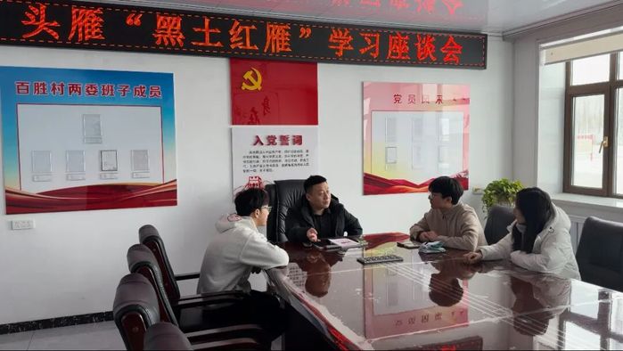 随后,实践团来到海伦市百祥镇百盛村,专访省乡村产业振兴带头人培育“头雁”、村党支部书记韩凤喜。访谈中,韩书记讲述了扎根乡村的奋斗故事:紧扣海伦市179.8万亩玉米种植布局,带头打破单一大豆种植模式,带动村民扩种玉米;组建志愿服务队破解秸秆处理难题,实现生态与经济双赢;暴雨天带头抢收玉米,最大程度减少村民损失。 漫步村中,学子们亲眼见到红色栅栏错落有致,水泥路四通八达兼具出行与玉米晾晒功能,村容整洁有序。韩书记打造“红色百盛”、完善基础设施的实干成效一目了然,也让学子们对乡村振兴有了更真切具象的理解。