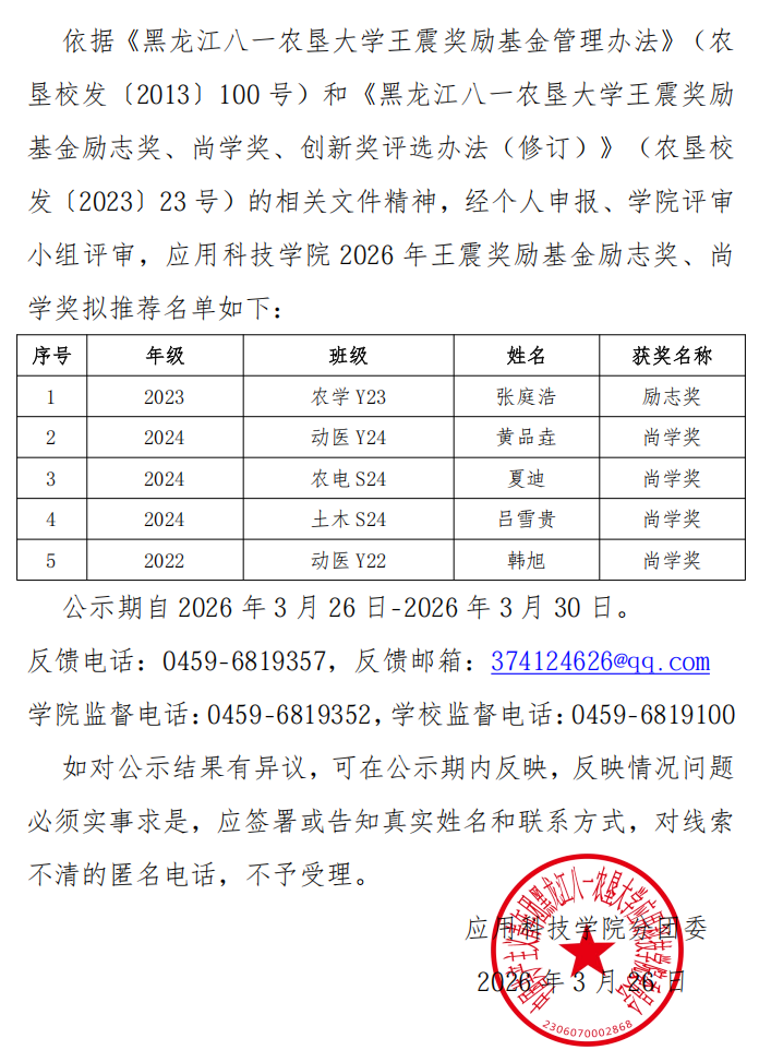 应用科技学院 2026 年王震奖励基金励志奖、尚学奖拟推荐名单公示