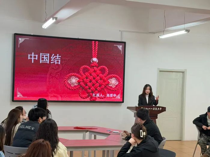 活动以中国结制作为核心,主持人先讲解中国结的起源与发展脉络,从结绳记事的古老智慧,到各朝代的文化传承,让同学们理解其承载的团结、平安、吉祥的美好寓意,感悟这一民族文化符号的深厚内涵。随后,主讲持人细致介绍编织材料与工具选择技巧,重点教学平结、纽扣结两种基础结法,结合口诀演示穿线、绕圈、拉紧、定型等步骤,分享线头处理、结形调整等实用技巧。同学们认真练习、反复尝试,将一根根红绳编织成精致的中国结。