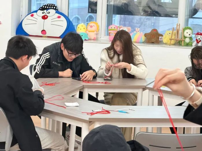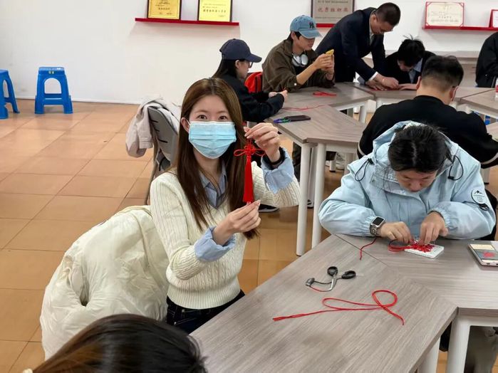 活动以中国结制作为核心,主持人先讲解中国结的起源与发展脉络,从结绳记事的古老智慧,到各朝代的文化传承,让同学们理解其承载的团结、平安、吉祥的美好寓意,感悟这一民族文化符号的深厚内涵。随后,主讲持人细致介绍编织材料与工具选择技巧,重点教学平结、纽扣结两种基础结法,结合口诀演示穿线、绕圈、拉紧、定型等步骤,分享线头处理、结形调整等实用技巧。同学们认真练习、反复尝试,将一根根红绳编织成精致的中国结。